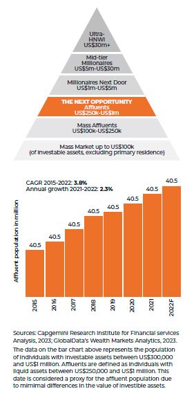 According to the World Wealth Report 2023 by Capgemini, affluent individuals, with investable assets between US$250,000-1 million, possess a staggering US$27 trillion in wealth. They form a significant population base and have the potential to become future HNWIs if engaged early in their financial journey within the wealth management ecosystem.